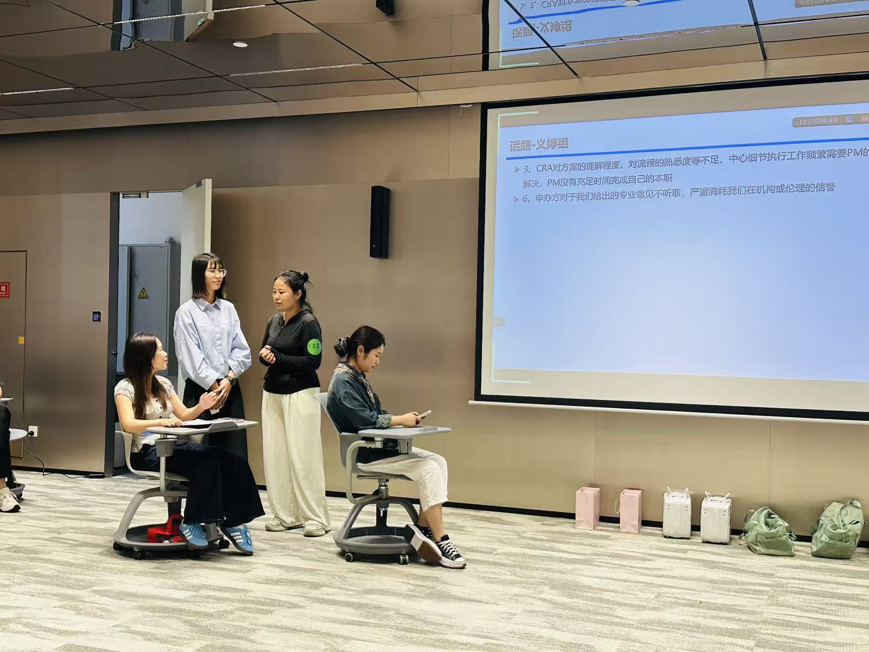 有效的溝通是團隊協作的基石。本次培訓引入了“非暴力溝通”理念,通過情景模擬與案例分析,幫助學員掌握傾聽、表達與反饋的技巧,減少人際沖突,提升團隊凝聚力。通過不同情節的生動演繹,團隊成員詮釋出日常工作中的各種棘手問矛盾,許多學員表示,這一環節讓他們重新審視了溝通方式,學會了如何以更平和、高效的方式解決工作中的矛盾。這不僅是一種技巧,更是一種修行,它能幫助我們化解與研究者、受試者或團隊成員間的潛在沖突,營造和諧、高效的工作氛圍。