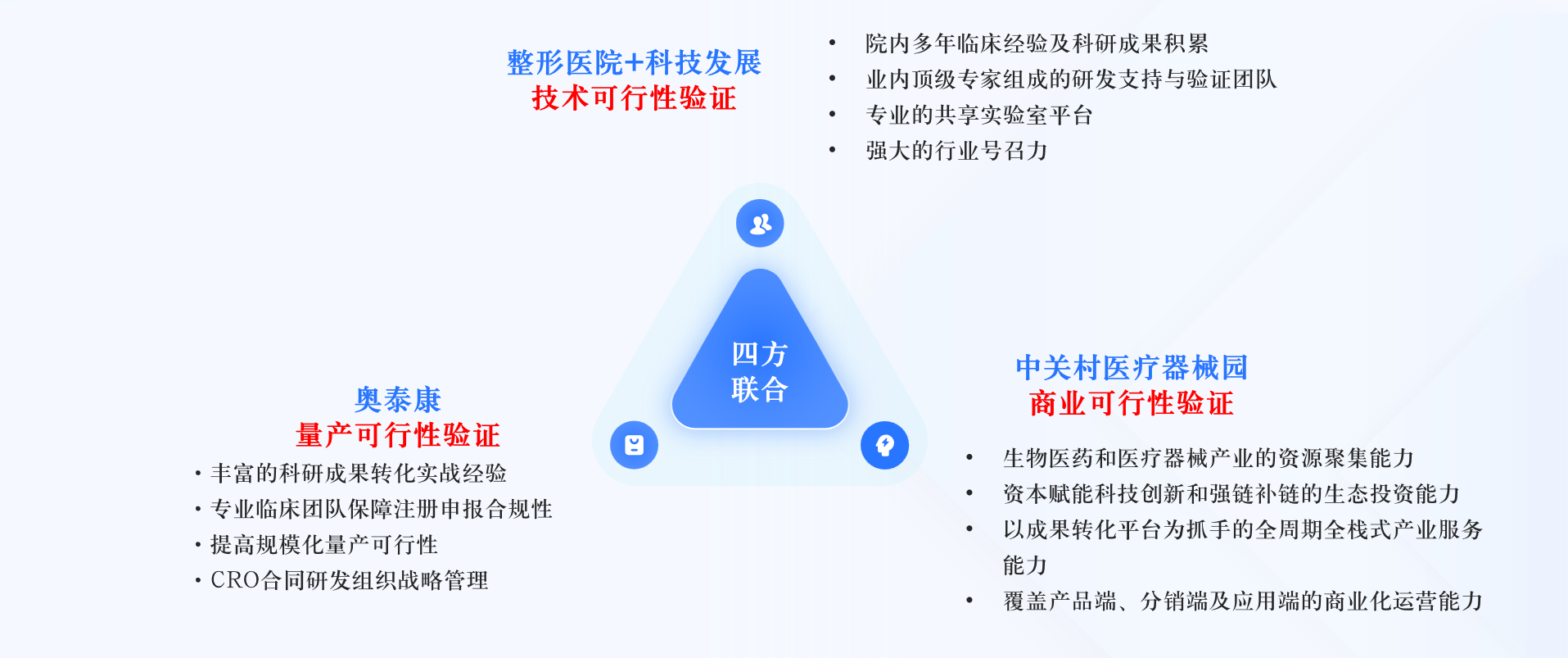 北京市整形醫學概念驗證中心項目,由四家單位聯合申報實施。其中北京八大處整形科技發展有限公司聯合中國醫科院整形外科醫院完成技術可行性驗證,北京奧泰康醫藥技術開發有限公司負責量產化驗證,中關村醫療器械園有限公司完成商業化驗證,四方相互協同,構建“醫研產銷”一體化生態。